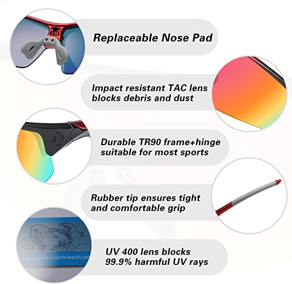 • 【FIVE INTERCHANGEABLE LENS】- All the lens 100% UV400 protection coating, blocks 100% harmful UVA & UVB Rays. Restore true color, eliminate reflected light and scattered light,make the scenery more clear and soft and protect eyes perfectly. The Main one is colourful lenses ,the yellow one is for night activities,the gray one is polarized for driving and other activities.