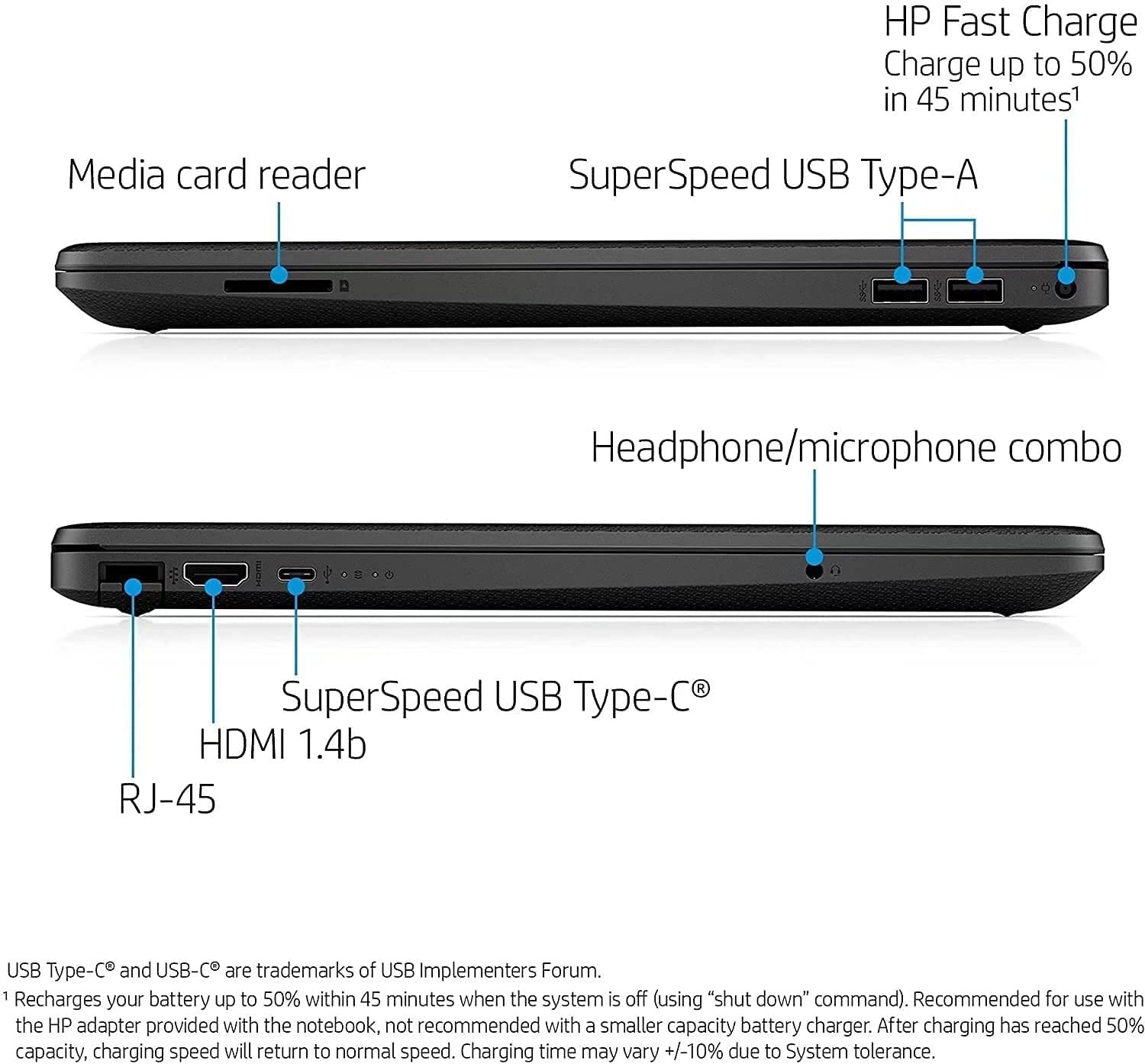 • External ports:1 SuperSpeed USB Type-C 5Gbps signaling rate; 2 SuperSpeed USB Type-A 5Gbps signaling rate; 1 HDMI 1.4b; 1 RJ-45; 1 AC smart pin; 1 headphone/microphone combo;