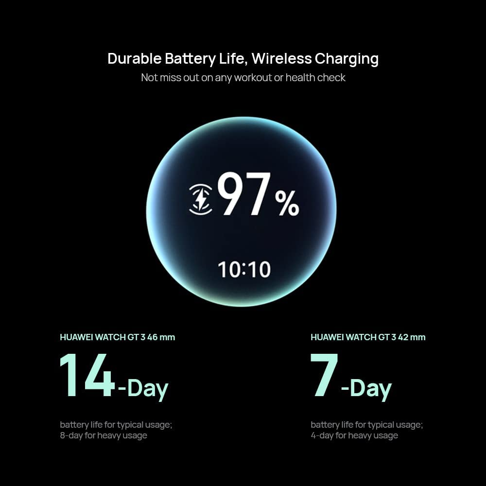 【Durable Battery Life】On a full charge, HUAWEI WATCH GT 3 42 mm lasts up to 7 days, so you're fully prepared to keep track of your every workout and not miss out on any health check. It supports wireless charging, so you can use your phone to reverse charge it when you forget your charger and say goodbye to battery life anxiety.