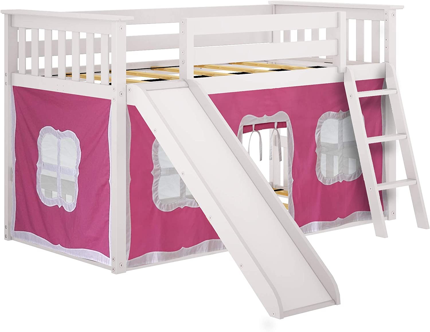Max & Lily Low Bunk Bed with Slide, Twin-Over-Twin Bed Frame For Kids With Curtains For Bottom